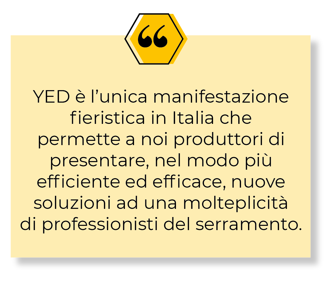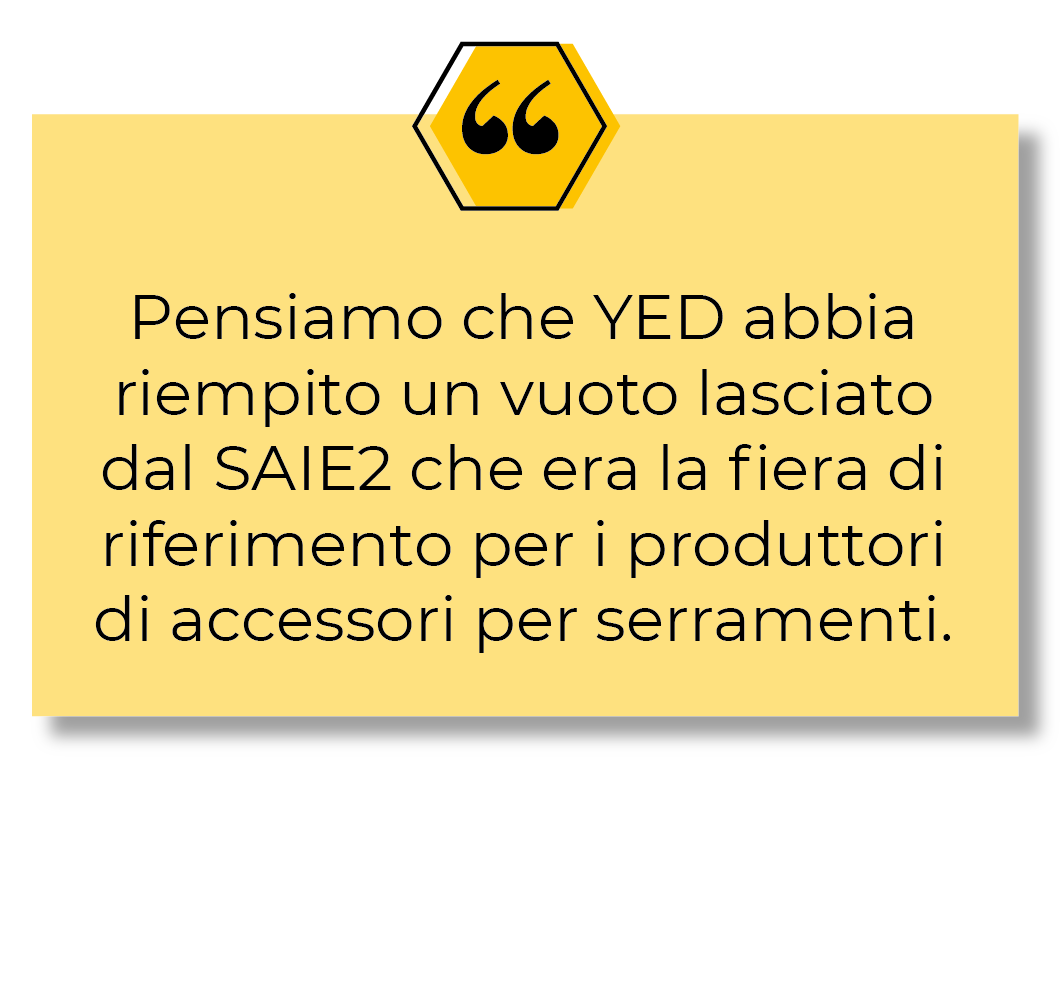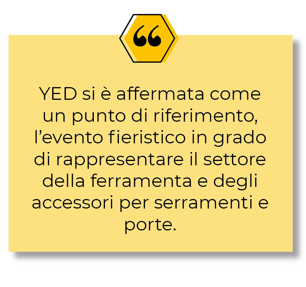 YED, acronimo di Yellow Expo Days, è la fiera biennale per i professionisti del serramento. L'evento è diventato un punto di riferimento in grado di rappresentare sul palcoscenico nazionale tutta la filiera in tema di ferramenta ed accessori serramenti, sistemi di oscuramento, protezione e sicurezza, involucro edilizio e schermature.